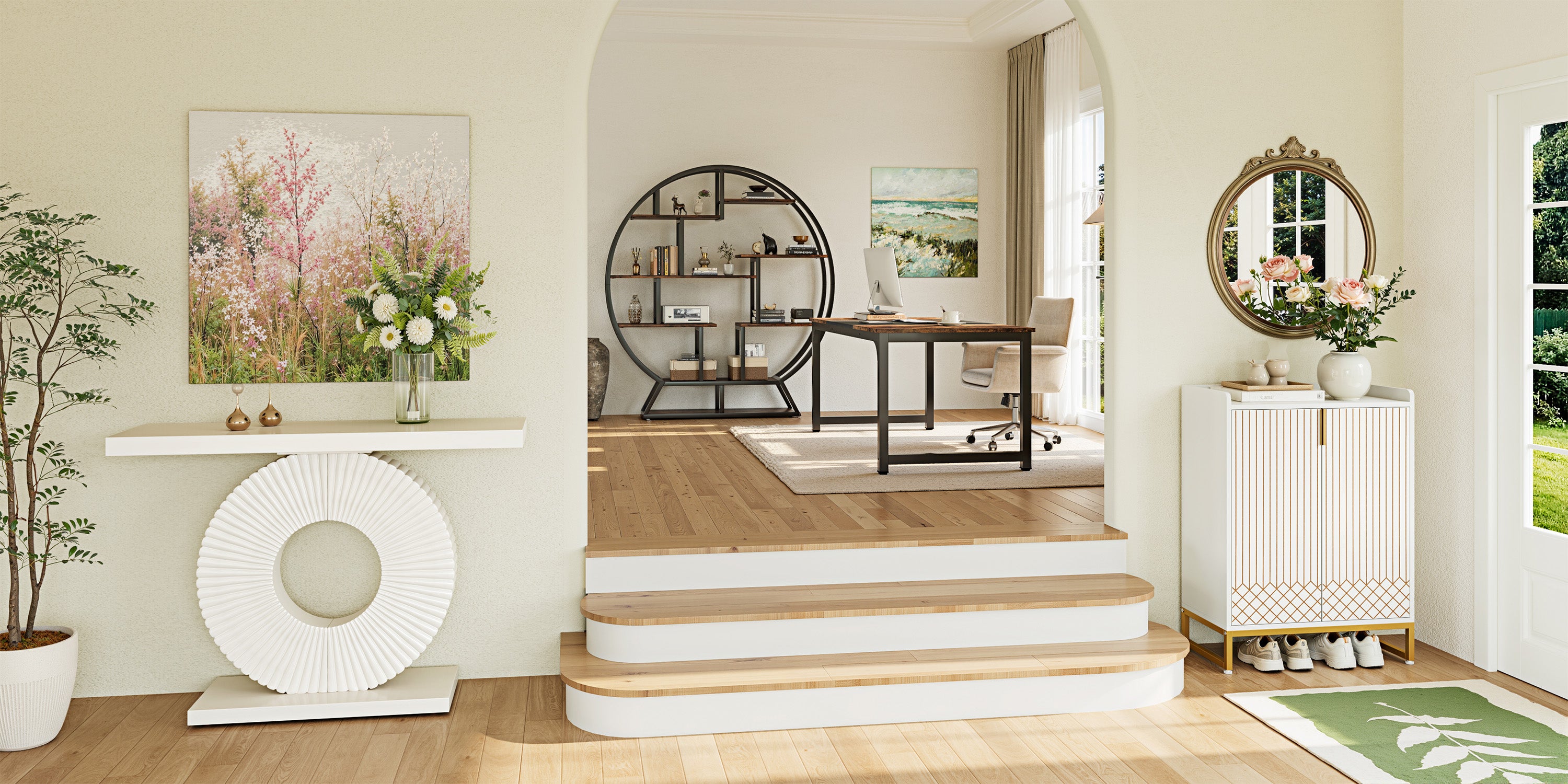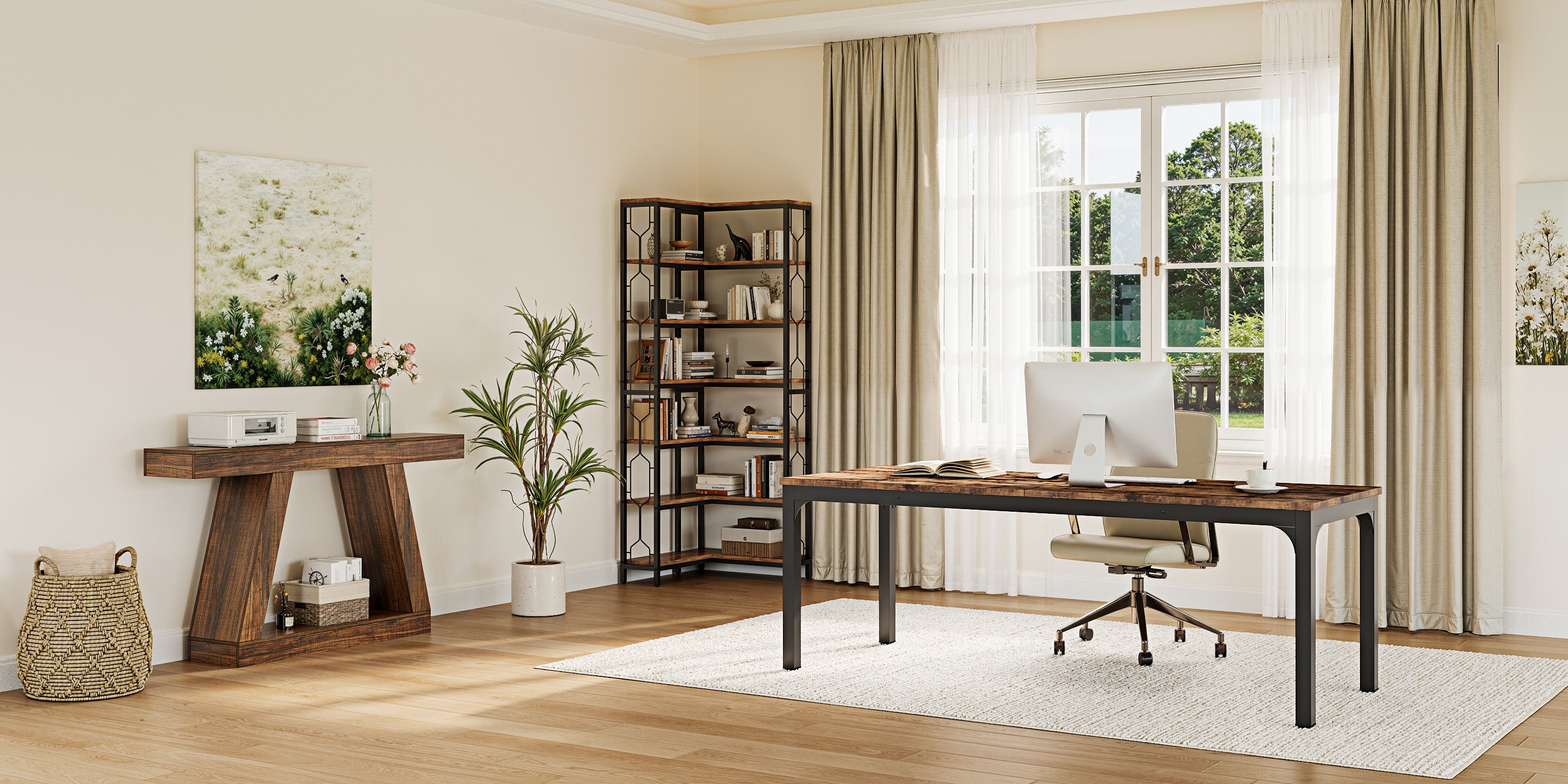 Tribesigns offre una gamma completa di prodotti di arredamento, come scrivanie, tavoli consolle, divani, organizer, librerie, tavoli da pranzo, banconi reception e credenze, ecc.